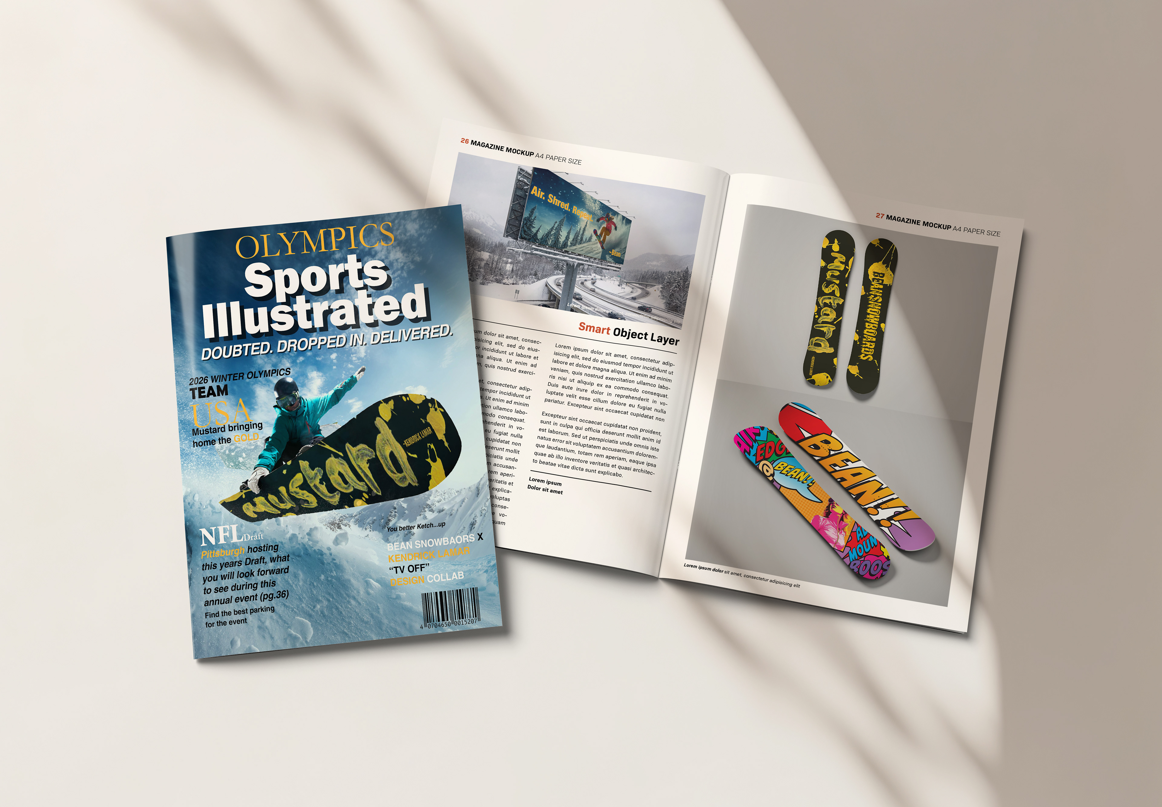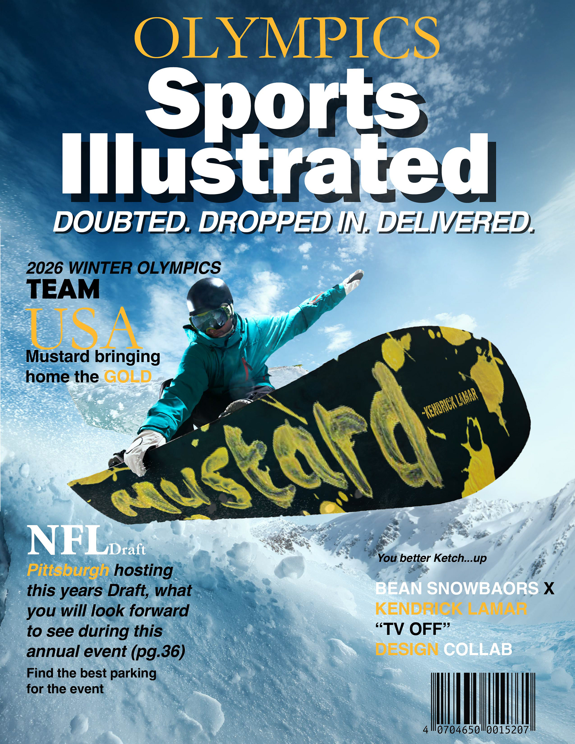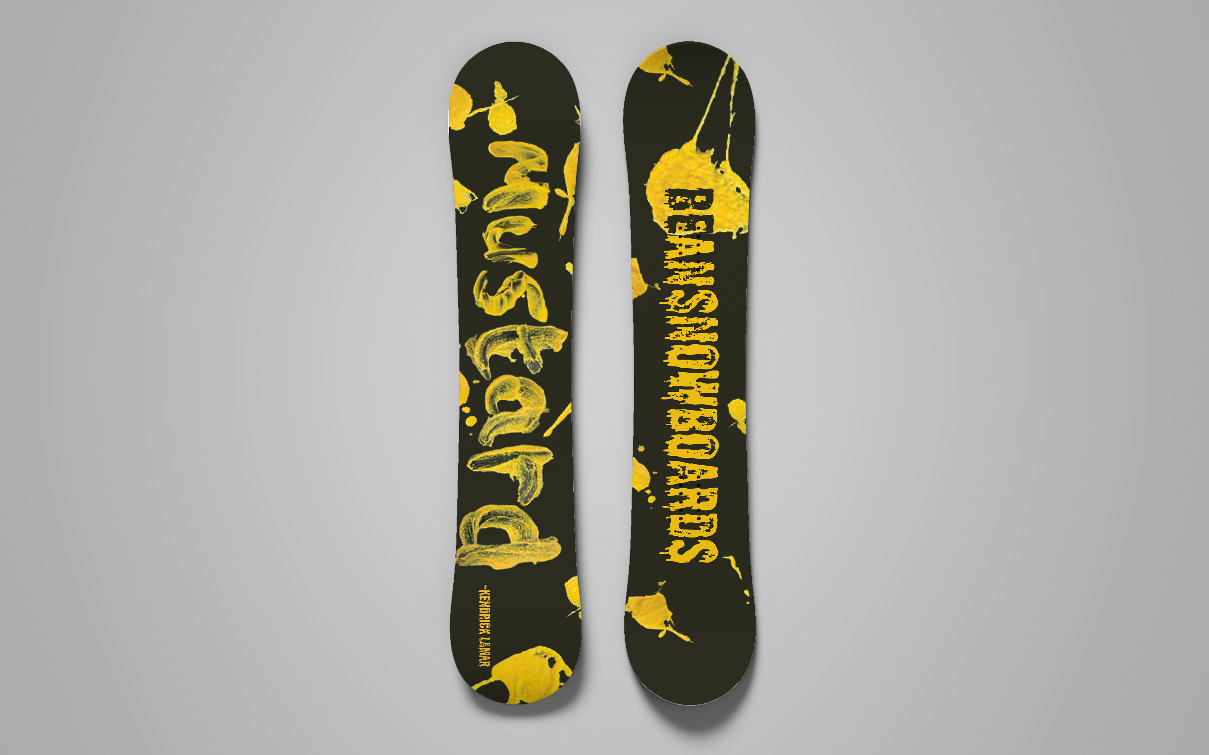 The Mustard Snowboard Series is a bold, culture-driven design project that merges music, texture, and extreme sport. Inspired by Kendrick Lamar’s lyric in the song “TV Off,” where he emphatically calls out “Mustard,” the concept transforms a fleeting musical moment into a striking visual identity. That single word is raw, energetic, and unforgettable. It became the foundation for the board’s aesthetic. To bring authenticity to the design, I used real mustard as a physical medium, creating organic splatters, smears, and brushstrokes directly onto a surface before digitizing the texture. The unpredictability of the condiment added grit and movement that traditional paint could not replicate. Once scanned and refined in Photoshop, the texture was shaped into bold typography across the snowboard deck, contrasted against a matte black background for maximum visual impact. I then composited the design onto action photographs of snowboarder’s mid-air, enhancing lighting, perspective, and shadows in Photoshop to create realistic, high-energy mockups. The result is a dynamic fusion of street culture and snow culture, where hip-hop expression meets adrenaline sport. The Mustard Snowboard Series celebrates spontaneity, texture, and cultural influence, turning a lyrical moment into a visually powerful ride.