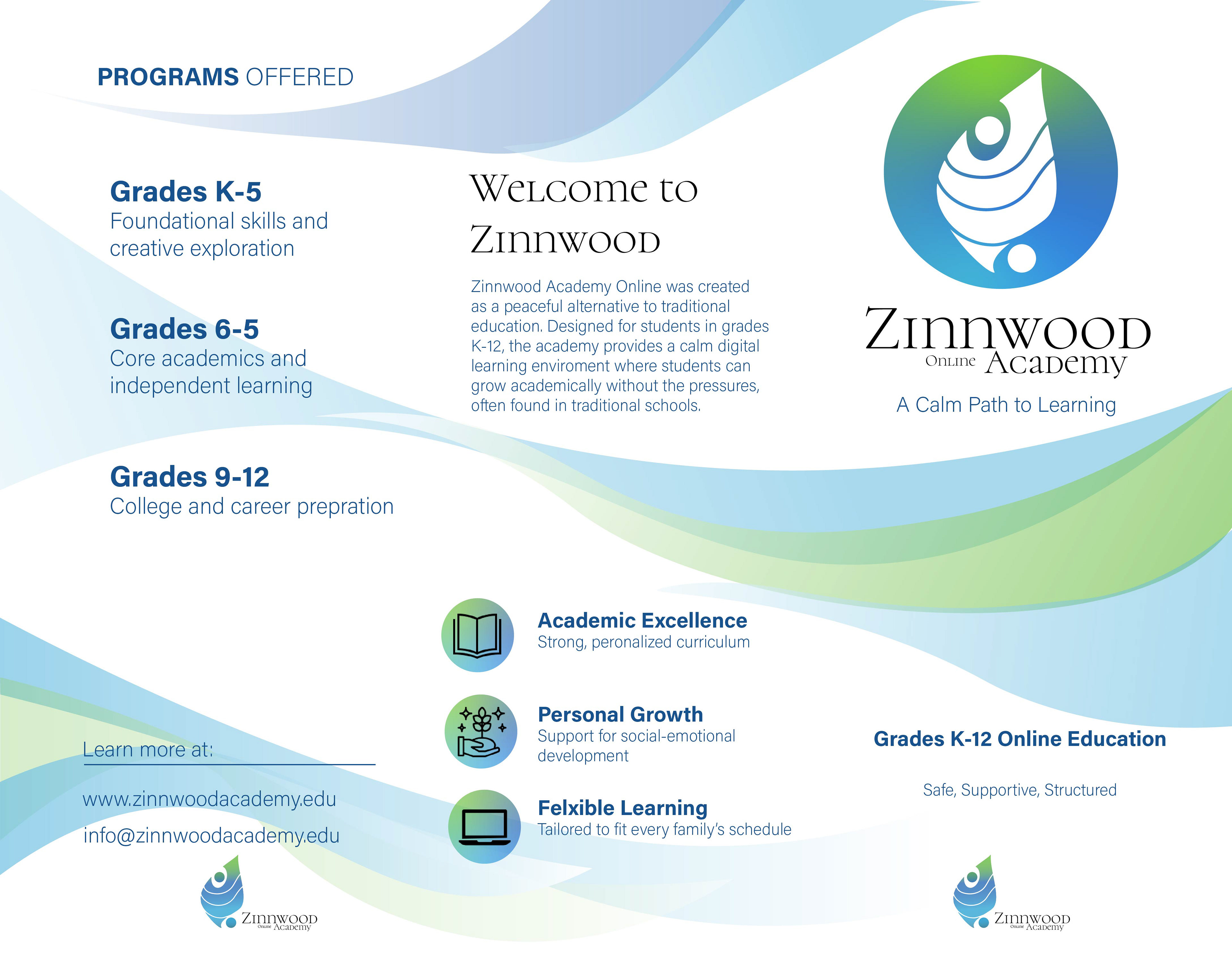 Zinnwood Academy Online was created as a safe, supportive, and calming alternative to traditional education. Designed for grades K–12, the academy provides families with a peaceful learning environment where students can grow academically without the pressures often found in public, private, or Catholic schools. The name Zinnwood is inspired by the feeling of calm and Zen, representing balance, clarity, and peace of mind for both students and parents. The brand identity reflects these values through soft gradients of blue and green, symbolizing trust, growth, and emotional wellbeing. The fluid, layered mark suggests protection and guidance while also forming an abstract figure that represents a student being supported. The circular version of the logo reinforces unity, safety, and wholeness, showing that every child is part of a secure learning community. Zinnwood Academy Online is especially committed to supporting students with special needs and those who may struggle in traditional school settings. It offers a bully free online space where children feel seen, heard, and respected. Academics are taken seriously, with structured programs that prepare students for future success while also recognizing that emotional support and individualized attention are just as important. This project focuses on creating more than just a school. It builds a trusted educational environment where parents can feel confident about their child’s future and students can thrive in a calm, structured, and compassionate setting.